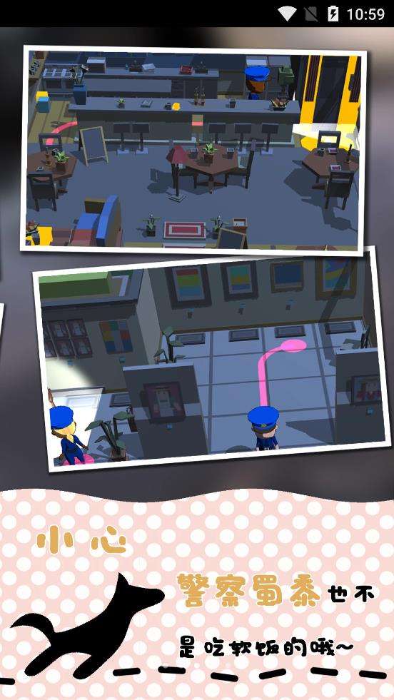 小偷别想溜在这款游戏中玩家们参与的是抓小偷的任务,同时大家也可以身份互换进行玩耍。首先,如果大家选择了这些小偷的角色,则要躲避检查,说出门来回的排查,他们手上拿着手电筒,而且都有固定的红色移动轨迹线路。偷到了自己需要拿到的物件之后就快速的,非要场景中出现的物品进行隐藏,让自己可以不被发现,并且成功的拿到出去。如果大家是警察叔叔的角色,咱要不断的控制多明警察角色进行移动,快速地听到声音,并把小偷抓获。