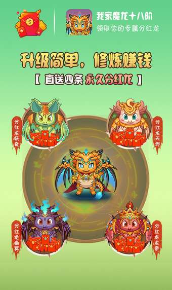 我家魔龙十八阶红包版是一款非常有意思的合成游戏,在游戏中玩家需要将相同品质的恐龙通过合成来获得更高一品质的恐龙,在这里拥有非常多不同的恐龙等你解锁,还有超多红包福利等你获取哦,赶紧加入吧。