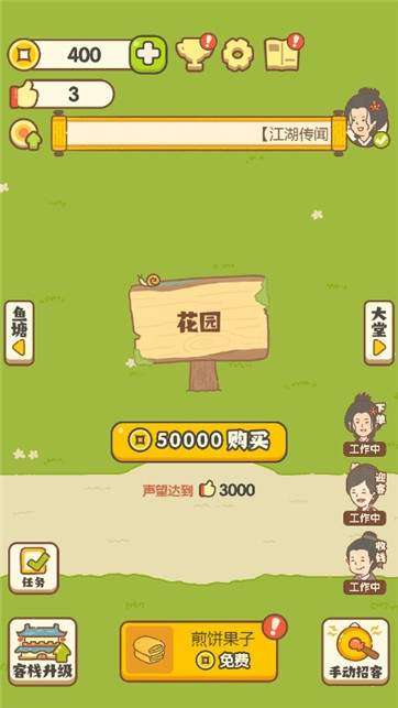 大掌柜来了是一款经营模拟类的游戏玩法,在游戏里玩家还将要去用自己的谋略在游戏里去开始打造自己的商业帝国,开局经营自己的客栈,招募大厨,豪华装修,轻松日进斗金,想要体验这款游戏的玩家不妨一试哦。