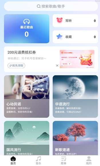 2、用户可以通过顶部搜索栏输入歌曲名称、歌手或歌词关键字来快速定位目标内容。同时,该平台提供超过十个音乐类别,包括流行、摇滚、民谣、电子以及影视原声,便于按兴趣进行筛选。