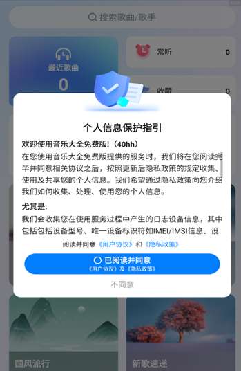 1、首次打开用户协议,点击“同意”进入主界面。主页清晰地显示了核心功能模块,包括流行播放列表、新歌交付、排行榜等。