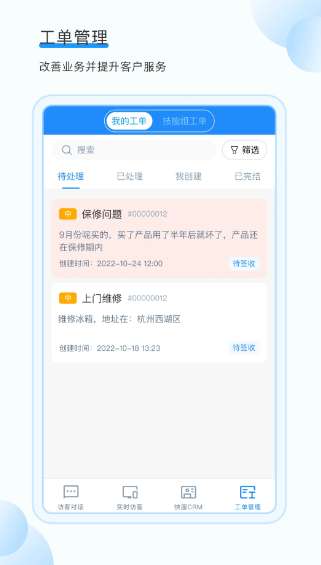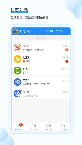 53快服是为客户支持而开发的移动办公软件,旨在帮助客户支持人员随时随地在办公室工作、在线交流,以及更高效地在办公室工作。软件可以实时接收人的信息。没有电脑也不会影响办公室。得益于手机的灵活方便,53快服不再限制时间和地点,客服人员24小时随时接受咨询,即使不在电脑前,也可以同样接待客户,每个碎片时间都可以使用,尽量减少来客流失。感兴趣的朋友不要错过下载。