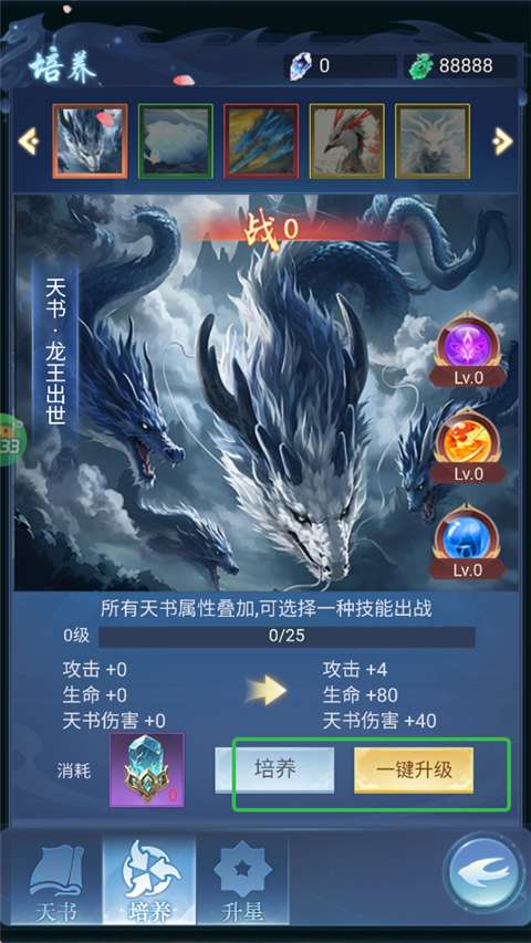 2、激活天书并升级、升星可提高攻击力、伤害力,而且所有天书属性可叠加,可以提升角色的战力值。