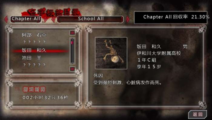 3、chapter 3:在烧掉头发后进入女厕所,然后女厕所漏水事件发生后原地不动等待窒息即可。 在取得1-C教室内被出现的幽灵攻击致死。