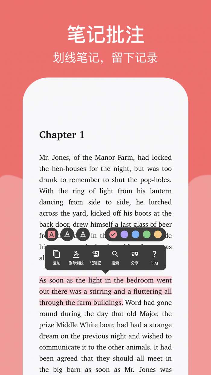 4、分色划线笔记与重点标注。可以用不同颜色的笔标注重点、疑问和生词,点击划线处直接跳转对应内容,复习时一键定位,高效梳理阅读重点。