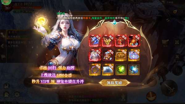 2、开局秒升VIP8,领取6480金币、神宠坐骑等豪礼,快速拉开战力差距。