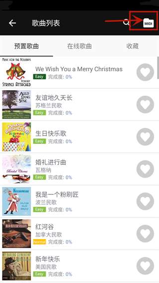 2、进入歌曲列表,点击右上角的“MIDI”。