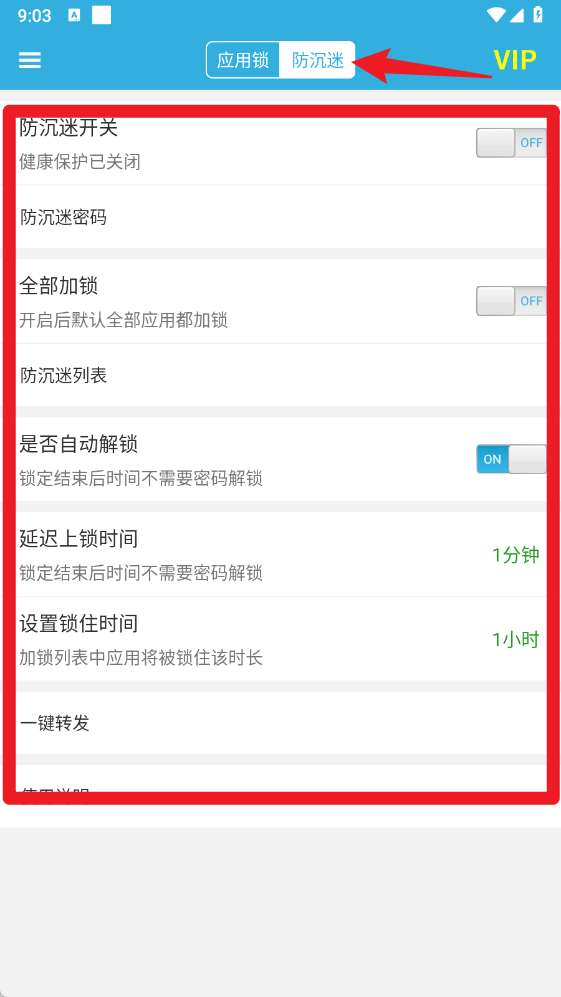 5、切换到【防沉迷】页面,可设置防沉迷开关、密码、是否自动解锁、延迟上锁时间和锁定时长等,帮助合理使用应用。