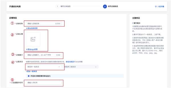 填写店铺名称、头像,选择主营类目等。