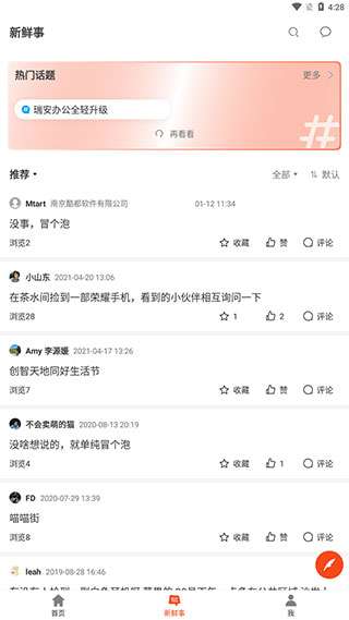 3、用户切换到【新鲜事】页面,可以查看其他用户发布的各种动态,如果你也想发布,可以点击右下角的红色图标。