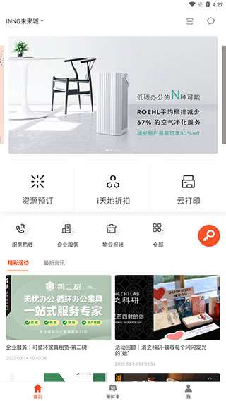 2、软件【首页】展示的是一些常用的功能,如资源预订、i天地折扣、云打印等,下方还有精彩活动和最新资讯内容。