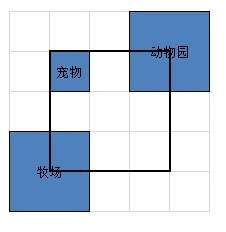在3*3的九宫格的地图里,任意3个格子里具有达成专业街所需要的3个建筑,这3个建筑就达成了专业街。对于占位大于一个格的建筑,该建筑的任何一个格子只要在这个九宫格内就可以,不需要整个建筑全在九宫格内,比如下图。