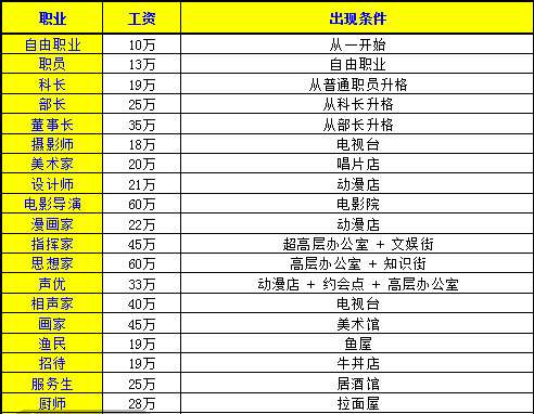 职业需要由办公室来发现,有居民在该办公室工作,随机发现周边产业建筑对应的职业。一些特定职业需要高级办公室或者超高层办公楼来发现。不同级别的办公室的影响范围不同,如果职业需要多个产业建筑,要发现该职业必须要使所有涉及的产业建筑都在该办公室的影响范围内才可以。如果职业的发现条件需要某专业街,那么需要在影响范围内至少具有一格构成该专业街的建筑。