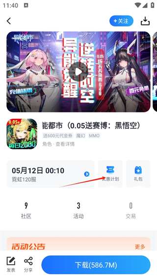 1、选择你要充值的游戏,进入游戏介绍界面,点击“优惠计划(优惠充值折扣+代金券)”。