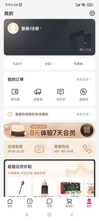 2、进入软件后,您可以看到五个部分:主页、发现、消息、购物车和“我的”。
