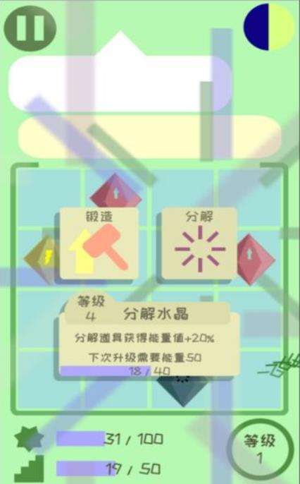 2、在这里会为你提供锻造,还有分解两个操作的按钮,你的游戏级别慢慢提升,之后关卡中放置的能量水晶数量就会不同。