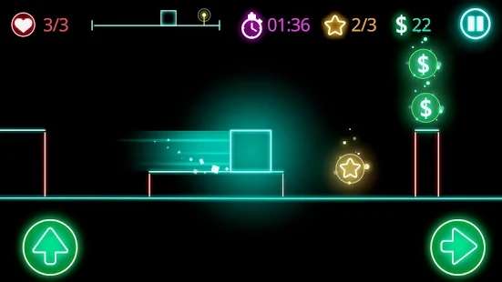 发光障碍道游戏中设计的是一个霓虹灯的场景,颜色很绚烂,因为背景是纯黑色的可以看到不同灯光颜色的变化,在这里大家要完成的跑酷就是控制了自己的方块角色在下面上面进行移动收集,黄色的金币图案,跨越不同的障碍,然后利用上面出现的一些障碍品,帮助自己跨越到另外一个地方。前面的左右两侧分别有前进和跳跃的按钮,自己通过简单观察的练习掌握了方法之后,就可以很快的去解锁,后面的新关卡任务。