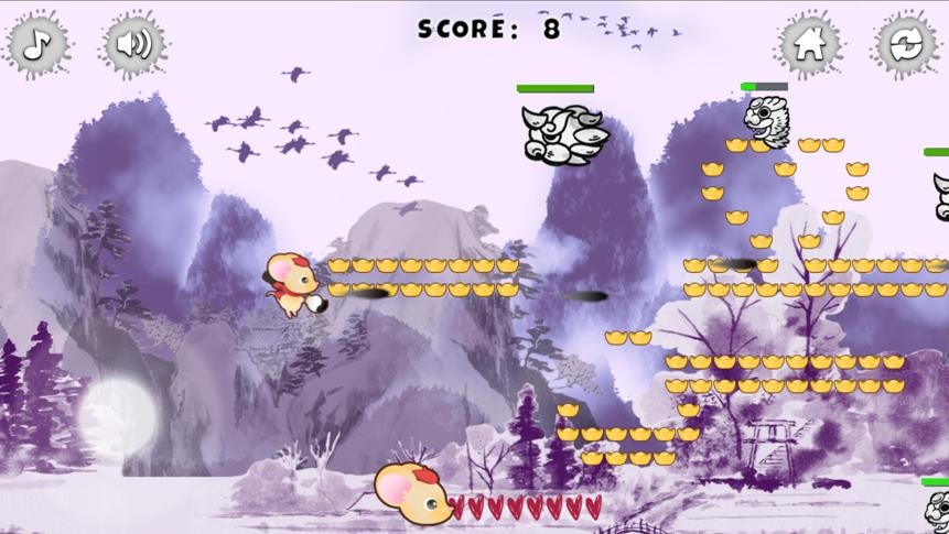 2、控制老鼠移动就是上下左右就行了,要不断的飞翔在空中,才能够去进行闯关。