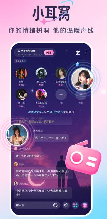 小耳窝app是一款比较温馨的社交聊天软件。用户可以用不同的语音资源交朋友。在软件上浏览您感兴趣的语音室。社区中有各种各样的聊天主题供您参与。它给你一整天最温暖的拥抱。你可以选择倾听不同的声音,发泄自己的情绪。你可以建立一个群聊模式,邀请你最感兴趣的人来拉近彼此的距离。为每一个用户提供一个治愈的声音体验。无论是劳累的工作日,还是孤独的夜晚,这里都有温柔的男声为你讲故事,为你歌唱,带给你心灵的慰藉。