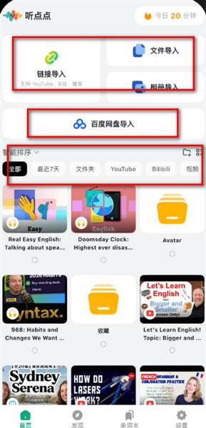 4、支持导入链接、文件、相册和网络磁盘内容,以在一个地方满足用户双语学习需求。