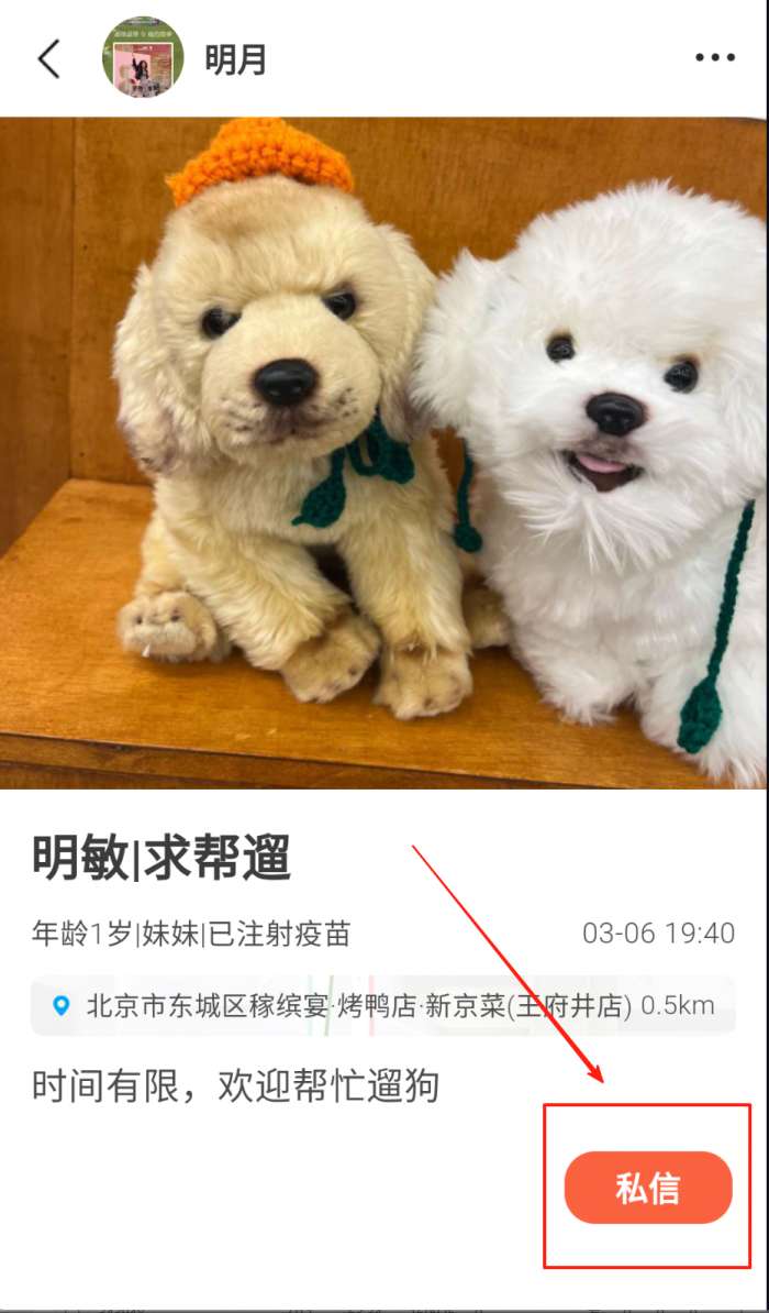 3、浏览他人发布的萌犬信息时,可通过即时通讯功能直接联系发布者。