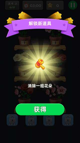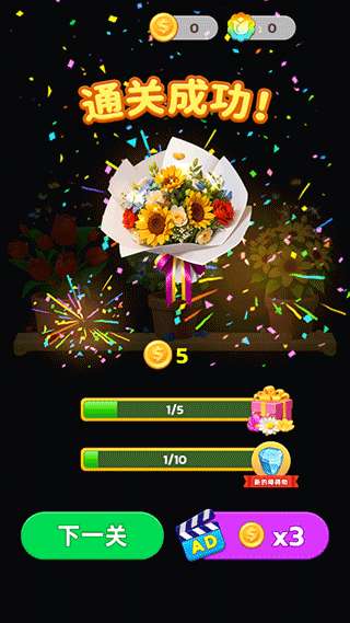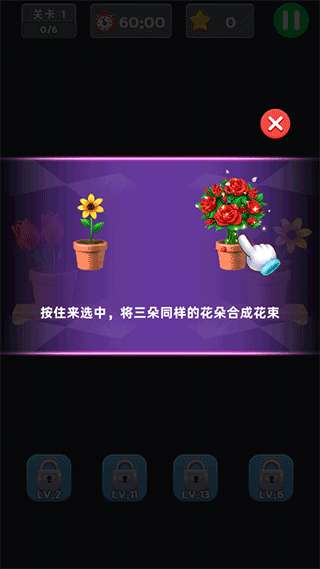 2、故事挑战模式:跟随花店老板的故事情节,恢复花园,准备婚礼花艺,解锁隐藏关卡和道具。