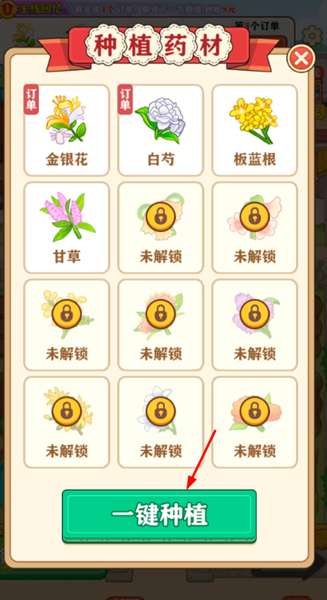 3、可以选择相应的药材进行一键种植,等待成熟,然后完成订单解锁更多药材从而赚取零花钱!