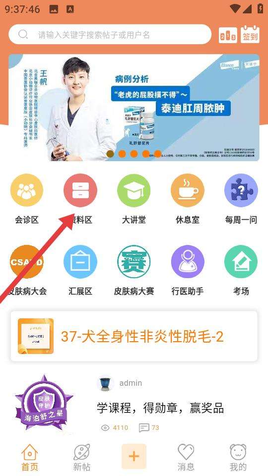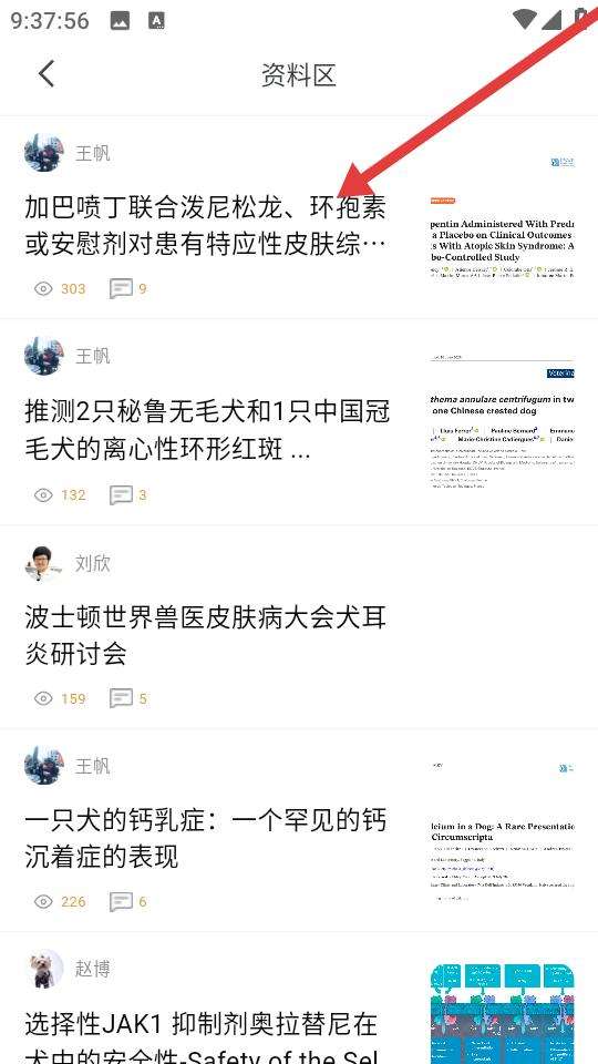 2、进入资料区浏览王帆刘欣等兽医分享的病例与行业研究,如特应性皮肤综合征犬耳炎研讨等内容,查看阅读量与评论,学习专业知识提升诊疗能力。