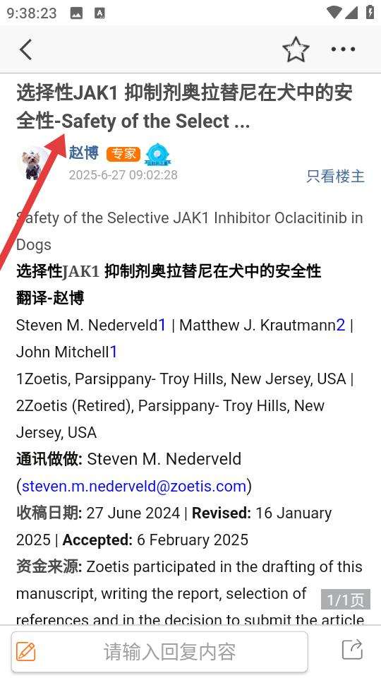 3、打开资料区文献查看选择性JAK1抑制剂奥拉替尼在犬中的安全性等研究,了解实验数据与结论,底部输入框可回复交流,与同行探讨学术观点。