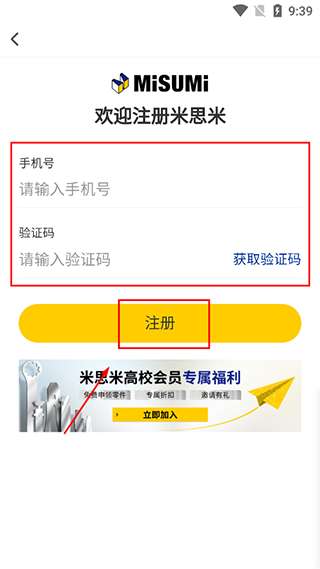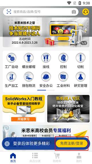 1、打开米思米闪购商城应用程序,点击“免费注册/登录”注册您的帐户。