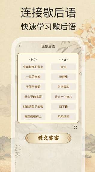 1、主题种类丰富)快乐答题王题库涵盖了成语典故、歇后语填词、古诗启示录、历史文化知识等满足不同玩家知识需求的各个领域。