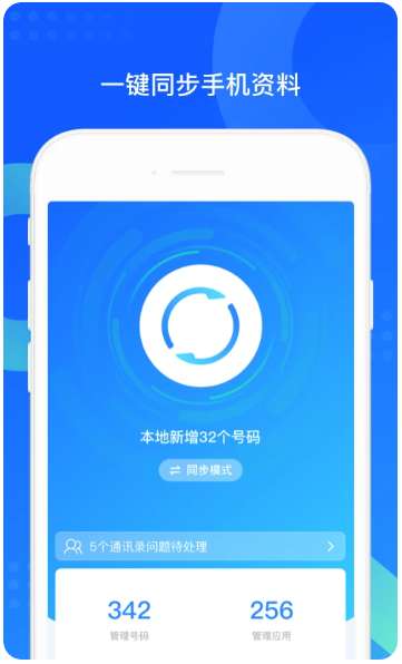 1、备份管理:手机通讯录一键备份至网络,随时同步回手机。
