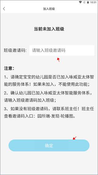 2、输入班级的邀请码,首先要先确认小孩的幼儿园是否加入了咏威亚太体智能服务体系,如果加入的话就可以直接输入邀请码绑定自己的班级了。