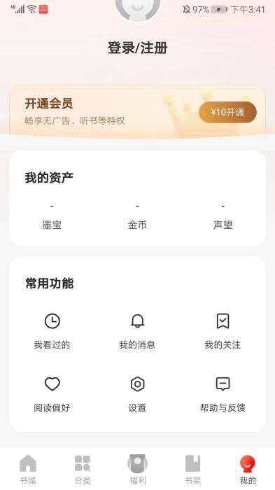10、进入我的界面,可查看自己的墨宝、金币、声望,以及进行阅读偏好等设置,以上就是阅瓣免费小说app的使用方法了。
