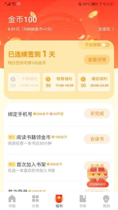 8、进入福利界面,完成签到、阅读、登录等任务后可以获得金币奖励,累积一定的金币后还可以进行提现。