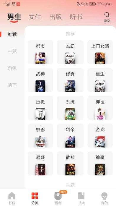 2、在书城界面,有推荐、男生、女生和听书等分类,我们可以选择自己感兴趣的分类。