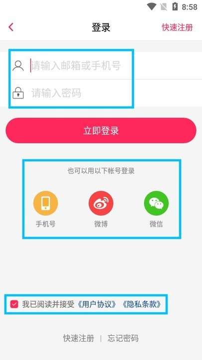 4、勾选【我已阅读并接受】,可以输入邮箱或手机号进行登录,也可以用其他账号进行登录。