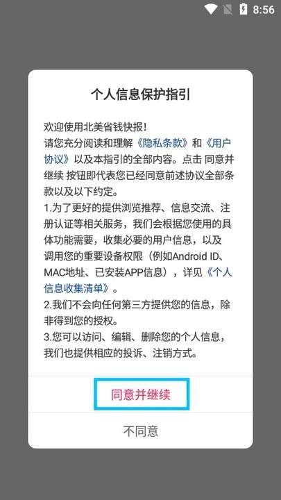 1、下载软件后直接安装打开,阅读弹出的个人信息保护指引,点击【同意并继续】。