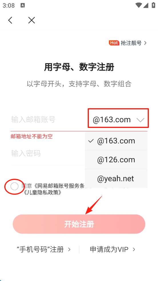 6、点击“@163.com”可以更换其他域名,随后可以自己输入用户名,勾选“同意...”,随后点击下方的“开始注册”。