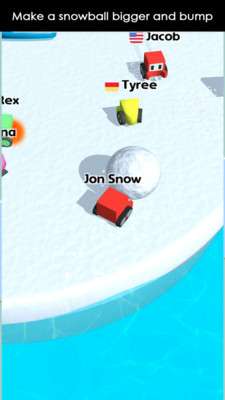 方块人滚雪球在这款游戏中,大家要选择好一个机器人的角色,然后选定一个昵称就可以开始挑战了,在这里大家可以选择属于自己的国家地区,后面的挑战中,你就能够看到你在与哪些地区的玩家进行PK挑战。每一个场景中都会匹配不同数量的玩家,主要的任务就是比比看谁堆的雪球大,谁就能够提升自己的排名。基本的任务就是控制自己机器人的番外,他的移动是自动的,只要控制了他在场景中进行左右的行走,让手中的雪球越滚越大。