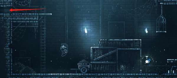 7、流浪者视角。按下黑色怪物左边的按钮,3个铁笼升上去,爬上铁笼往右走,然后爬最右边的梯子上去。