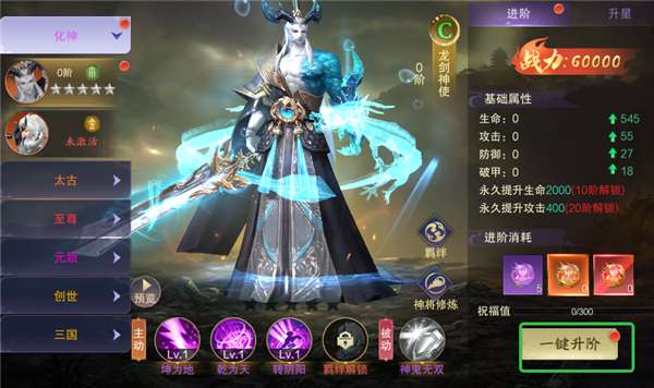 神将进阶将提升攻击、防御、生命、破甲等属性,且神将升级到指定等级可以解锁新技能。