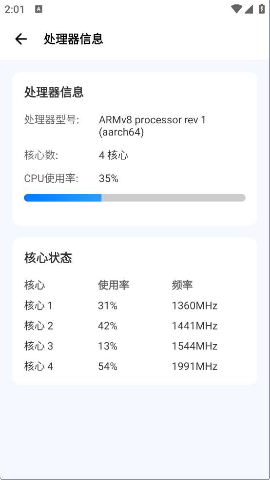 显示CPU核心负载、内存占用、电池电量及存储空间。