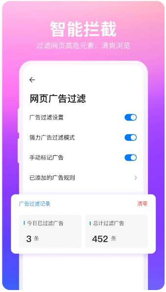 3、【智能拦截】2级强力过滤,高危因素,保护互联网安全,每一页都能清爽浏览。