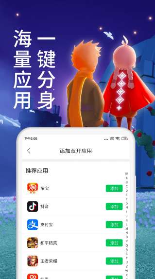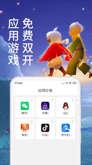 2、免费支持光遇分身、PUBG分身、王者等几乎所有应用分身双开。