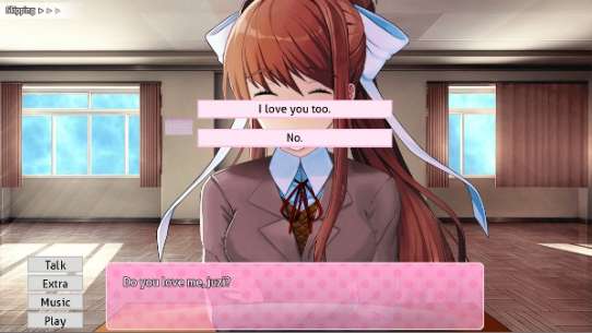 《Just Monika》是一款日式风格的2D动画风格的浪漫模拟手机游戏。在游戏中,设计了一个名为莫妮卡的虚拟女性角色。玩家可以在游戏中与这个角色进行互动和交流。同时,游戏有着丰富的情节。玩家可以通过与莫妮卡的对话以及做出不同的选择来推进剧情。他们还可以选择不同的故事线。沉浸在这一高度逼真的2D世界中的浪漫生活中。