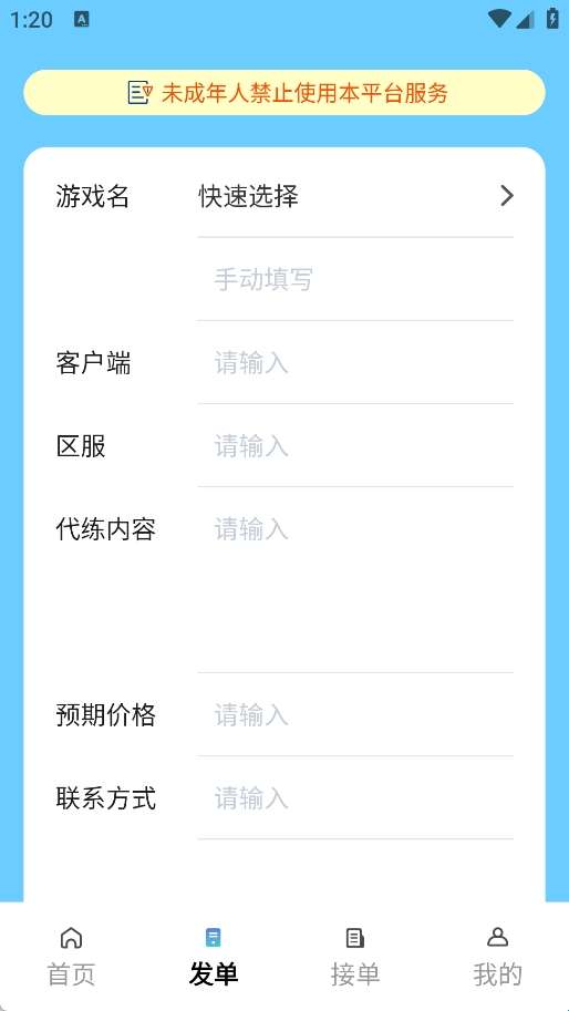 2、在发单页面中选择游戏名,输入客户端、区服、代练内容、预期价格以及联系方式等信息,然后点击立即发单;
