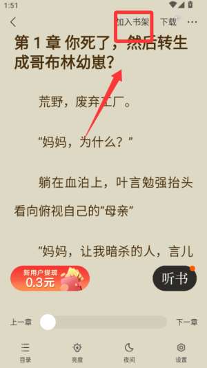 3、点击书籍详情页加入书架,进入阅读界面后可调整字体、背景等排版设置。