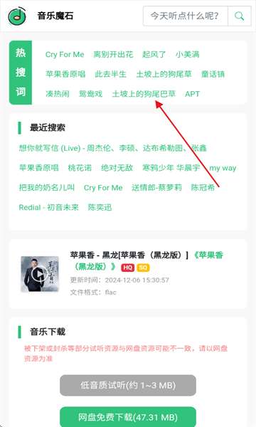 1、在软件主页上,您可以根据热门搜索关键字过滤您最喜欢的歌曲内容。