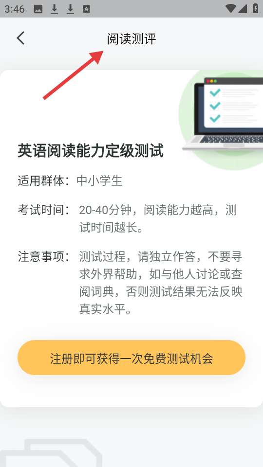 2、阅读测评页面,提供英语阅读能力定级测试面向中小学生,测试20、40分钟,注册可得一次免费测试机会。